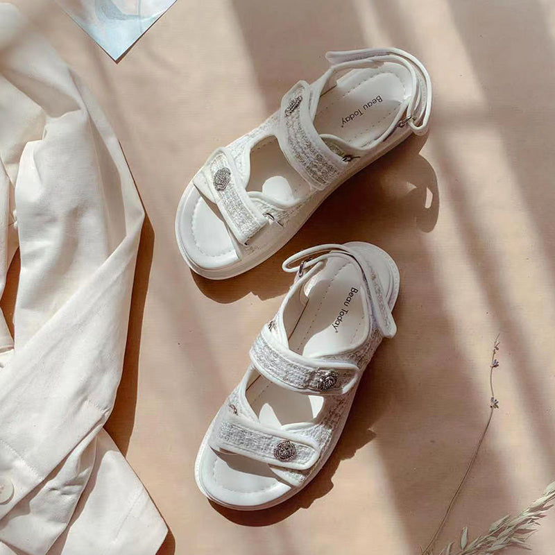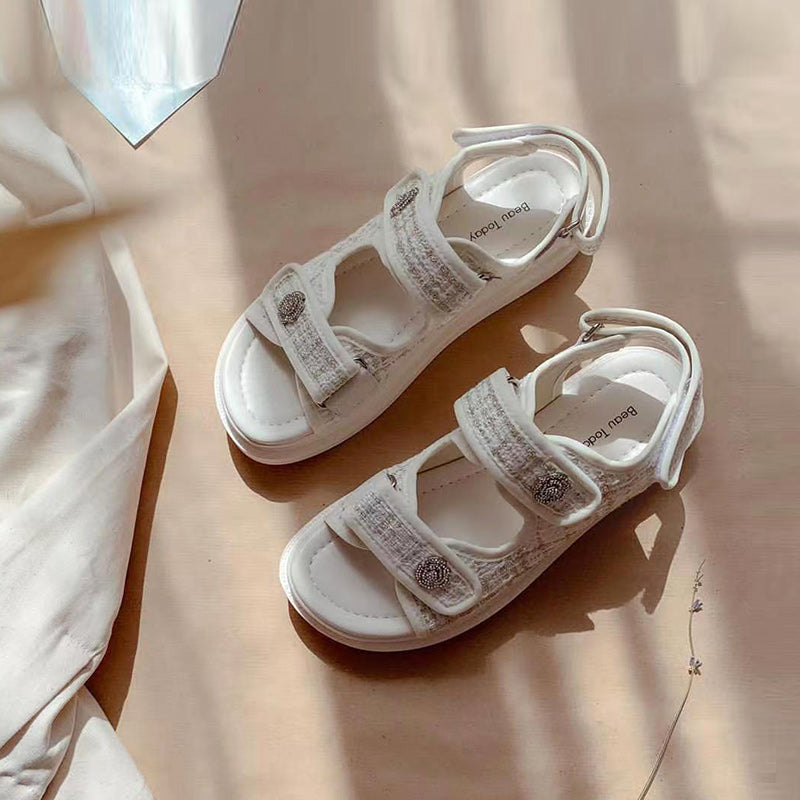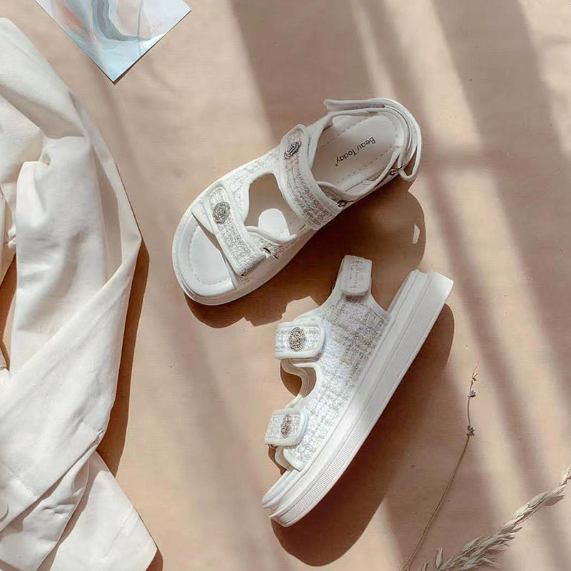 Characterized by the delicate flower decoration made of rhinestones and plaid cloth upper, these summer sandals, with a hook and loop closure, are  easy-on and easy-off, versatile to work with everything. Let's enjoy summer!
